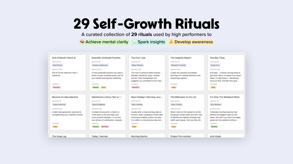 ⭐️ An airtable of 29 unique Self-Growth Rituals sourced from high performers and thought leaders such as Sahil Bloom, Brie Wolfson, and Andrew Huberman.